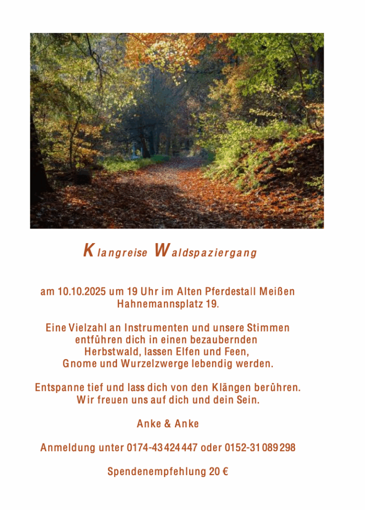 Klangreise Waldspaziergang ~ mit Anke & Anke Klangreise Waldspaziergang ~ mit Anke & Anke Termin: 10.10.2025 (19:00 Uhr) bis (20:30 Uhr) extern – _ Claudia2025-09-26T14:55:42+02:00